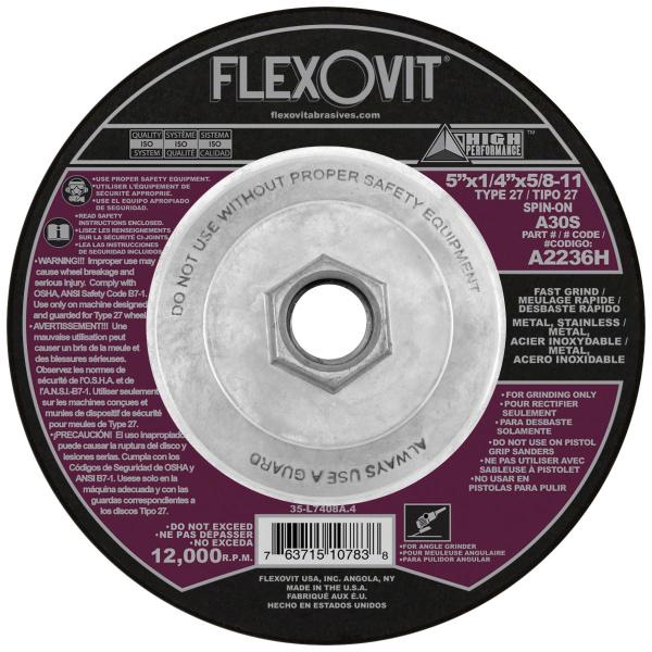 A2236H Flexovit® 5" X 1/4" X 5/8" - 11 HIGH PERFORMANCE™ 30 Grit Aluminum Oxide Grain reinforced Type 27 Spin-On Depressed Center Grinding Wheel