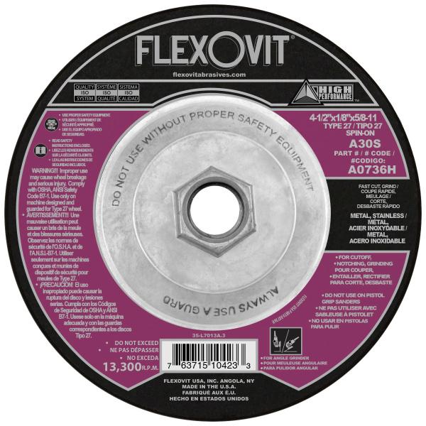 A0736H Flexovit® 4-1/2" X 1/8" X 5/8" - 11 HIGH PERFORMANCE™ 30 Grit Aluminum Oxide Grain reinforced Type 27 Spin-On Depressed Center Combination Wheel