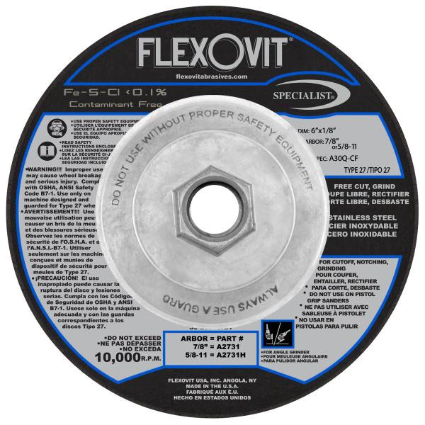 The A2731H Flexovit® SPECIALIST® STAINLESS STEEL 6" x 1/8" x 5/8"-11 Combination Wheel is engineered for professionals who demand fast, precise, and contamination-free cutting and grinding on stainless steel and corrosion-resistant alloys. Designed with a convenient spin-on arbor, this Type 27 depressed center wheel delivers unmatched productivity through rapid, tool-free installation—ideal for busy fabrication shops, industrial facilities, and field operations.