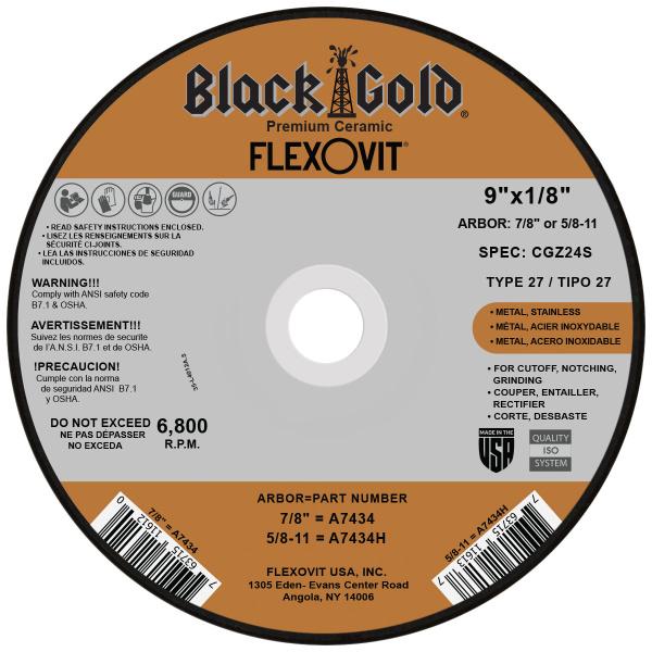 The A7434 Flexovit® BLACK GOLD® 9" x 1/8" x 7/8" Combination Wheel is engineered for metalworking professionals who demand exceptional performance, durability, and speed. Featuring a premium 24 grit zirconia ceramic grain, this wheel delivers aggressive cutting action, superior grinding efficiency, and long-lasting performance on the toughest metals—making it ideal for industrial fabrication, pipeline work, shipbuilding, and heavy equipment maintenance.